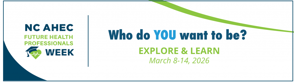 We are excited to announce that NC AHEC Future Health Professionals Week is scheduled for March 8 – 14, 2026! This statewide initiative is designed to inspire high school students and families to explore health career pathways and learn about opportunities across North Carolina.
